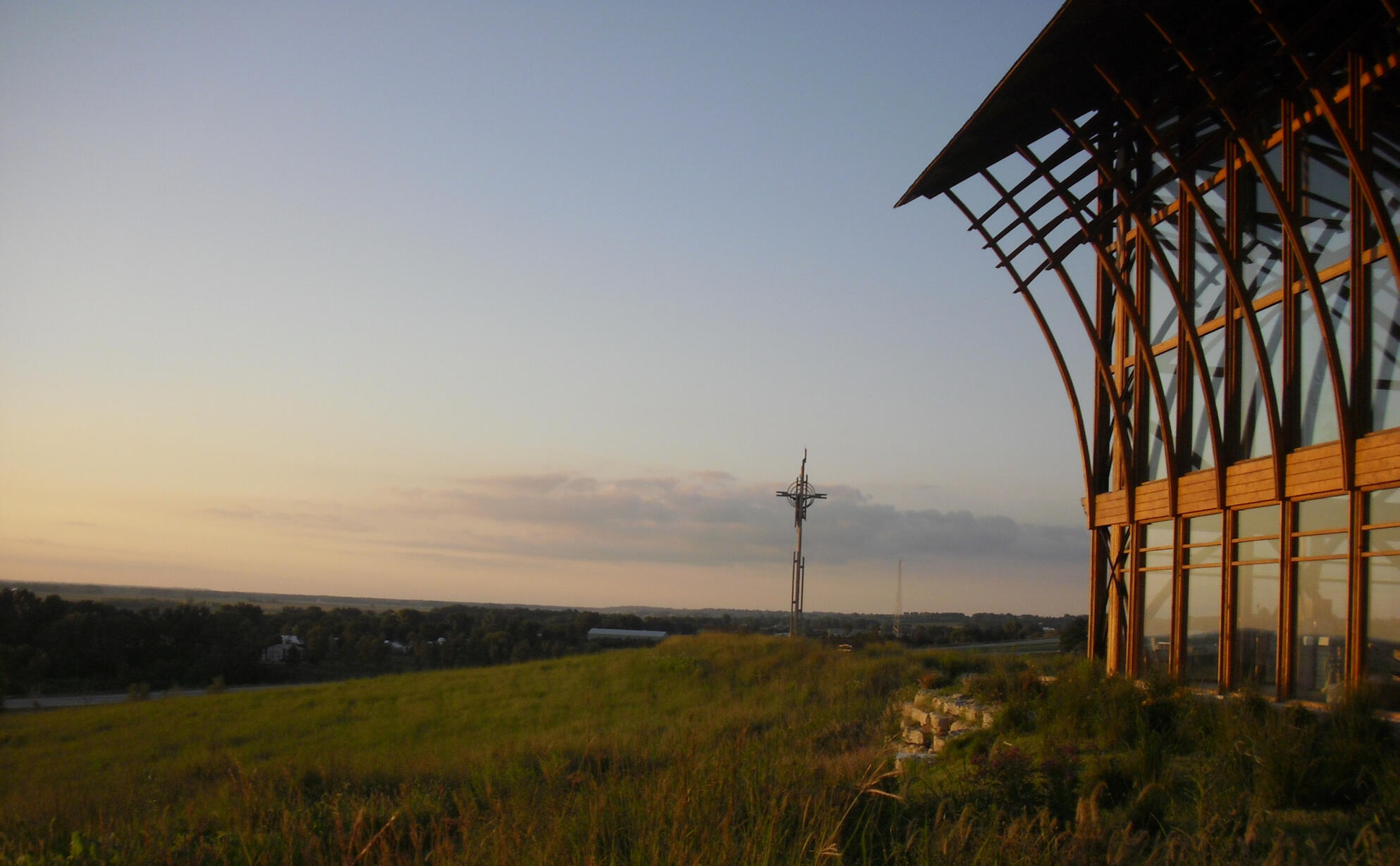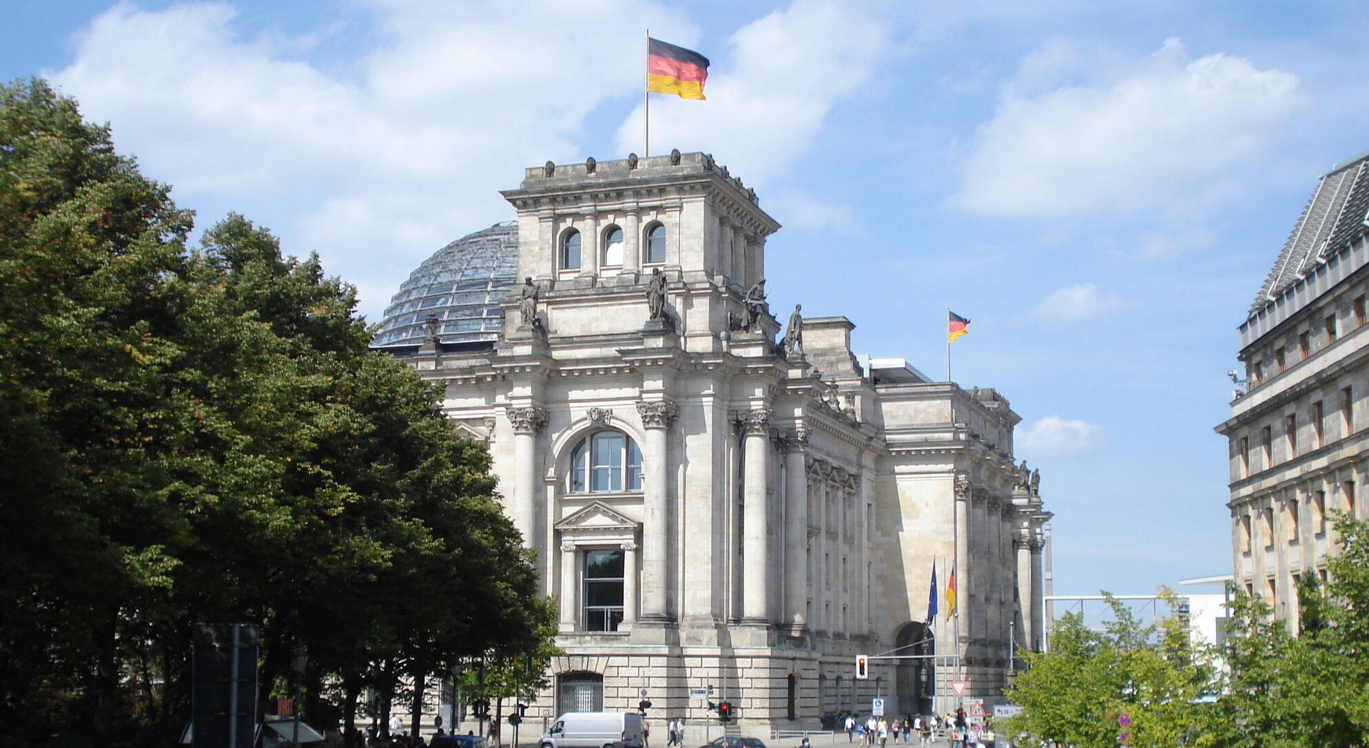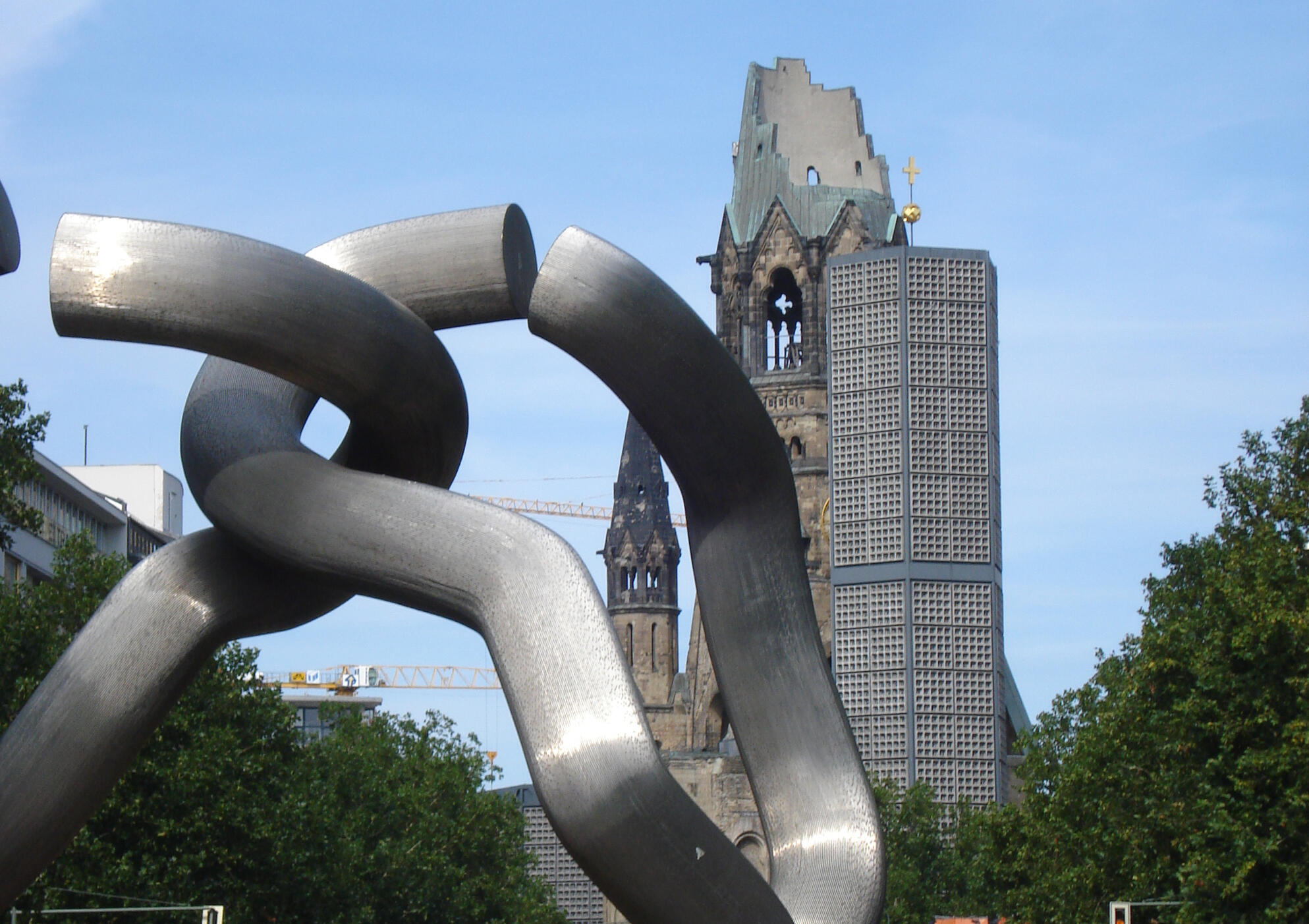 Time warp view from the boulevard, spaghetti sculpture in the foreground; modern built church spire and WWII bombed out church intermingled in the background.